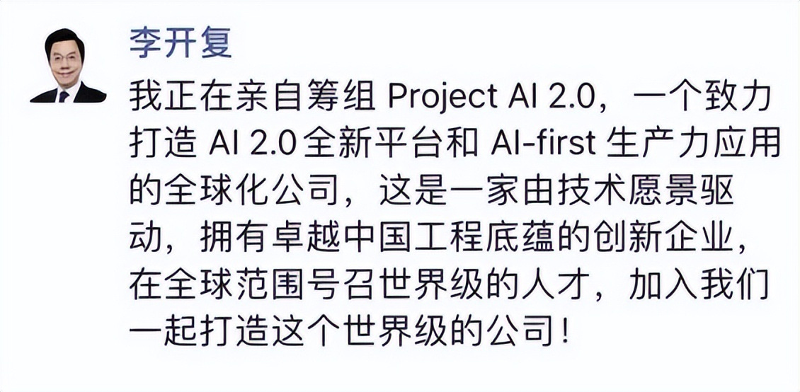 根据李开复当时的朋友圈,零一万物要在全球范围号召世界级的人才,一起打造一个世界级的公司。
