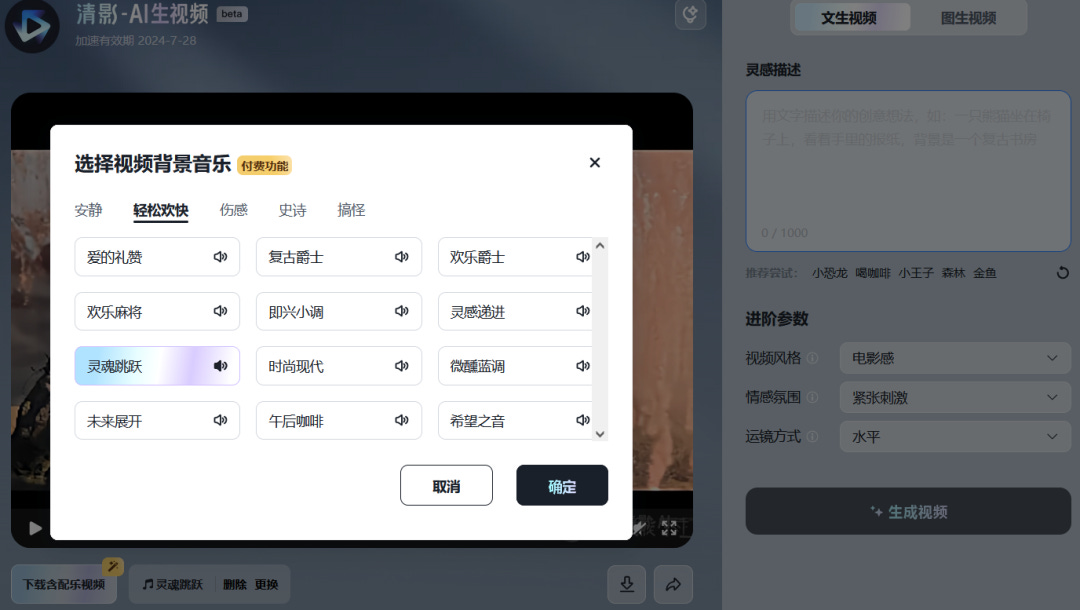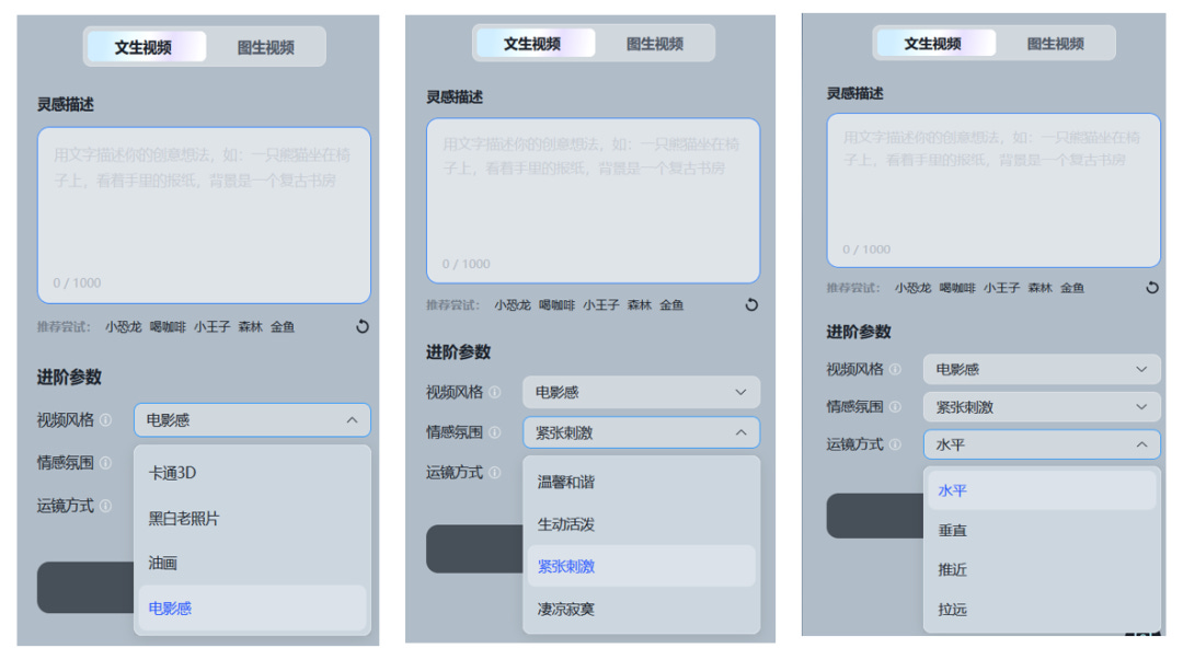 在文生视频功能下,用户可以根据自己的喜好,来设置一些参数,包括:视频风格、情绪氛围、运镜方式。