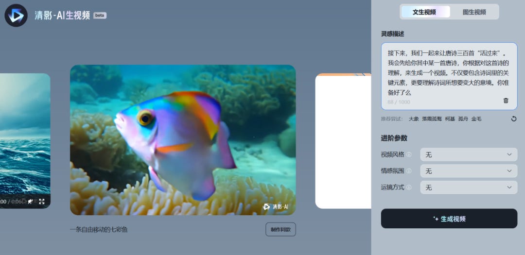 接下来,上点难度。目前,智谱清言的视频生成功能,最多支持1000字。那我们就用长一点的诗歌来考考它,李白的《将近酒》是一个不错的选择。