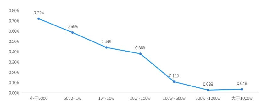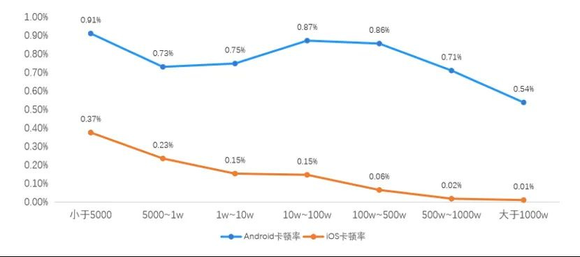 跟崩溃率类似,卡顿率也有一个“下降曲线”——卡顿率随DAU增长而下降。随着日活规模的扩大,尤其是当DAU超过100万后,卡顿率显著下降,这表明大规模用户的应用,能够通过更多的资源和优化措施来提升性能,从而减少卡顿现象。