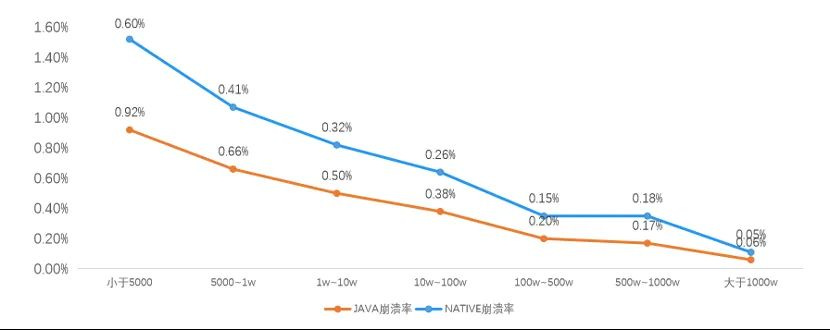 还有一个有意思的现象,Android端 移动应用崩溃率随日活(DAU)规模增大而逐步下降,且在日活(DAU)1万时出现拐点。