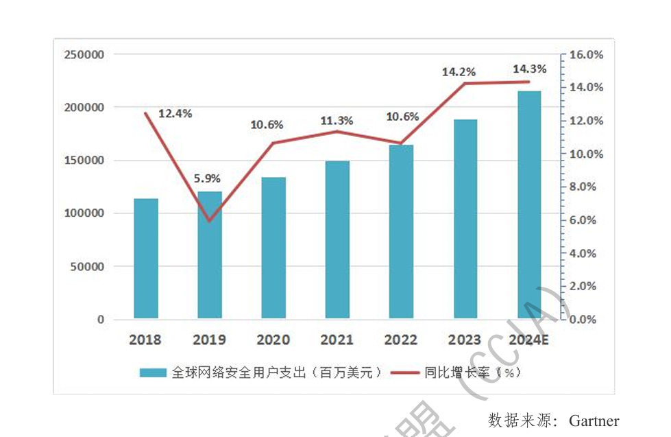 透过这件事,更进一步展示了目前全球范围对网络安全的高度重视。根据《中国网络安全产业分析报告2024年》中的数据显示,2019年至2024年全球网络安全支出同比增速呈现上升趋势,预计2024年将达到2149.5亿美元,同比增长14.3%,全球网络安全需求仍然强劲。细分领域看,安全服务、基础设施保护、网络安全设备支出占比最高,2024年将分别达到41.9%、15.5%、11.3%。