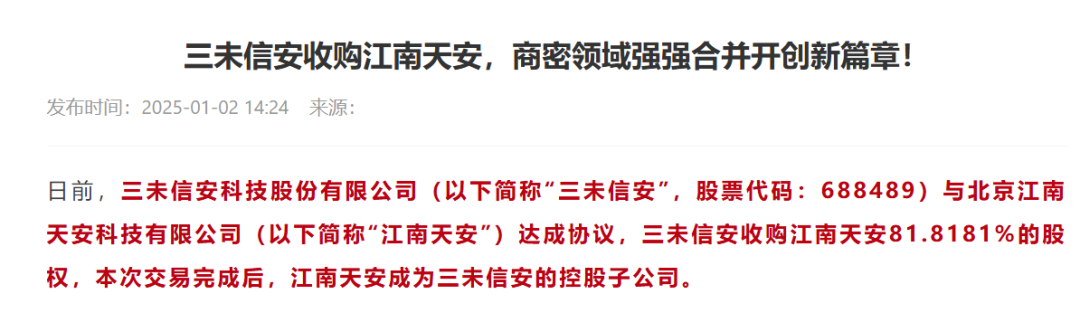 2025年1月,三未信安官网正式发文发文称,已与北京江南天安科技有限公司达成协议,收购江南天安81.8181%的股权,本次交易完成后,江南天安成为三未信安的控股子公司。