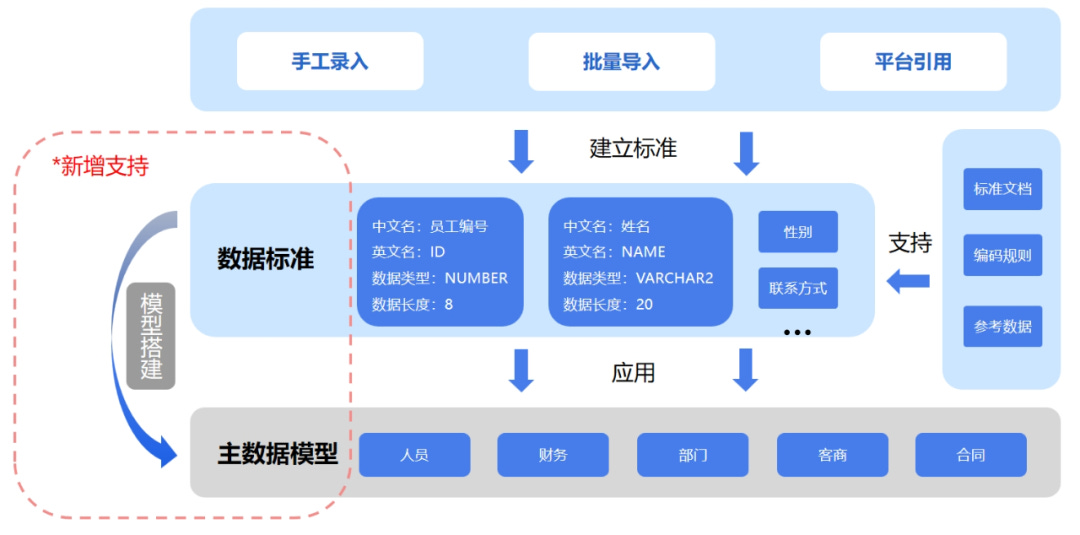 2025新功能创新性地实现了数据标准与主数据模型的动态关联与同步。用户在平台中维护一套全企业统一的数据标准目录。当在EsMDM中创建或修改主数据模型(如“供应商模型”)时,可以直接从标准目录中引用字段标准(如“统一社会信用代码编码规则”)。一旦业务标准更新,管理员只需一键触发“标准同步”,所有关联模型的对应字段属性(如长度、值域)将自动更新,无需人工逐个修改上百个模型,彻底解决了标准执行“最后一公里”的难题。
