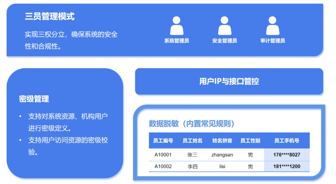 三权分立:打破传统“超级管理员”的无限权力,引入行政系统中的分权制衡理念。系统管理员负责技术运维,安全保密管理员负责权限分配,审计员独立负责监督审计日志。三者权责分离,有效防范内部风险。