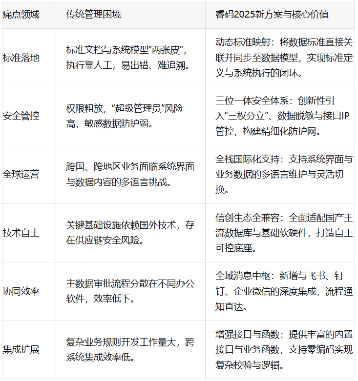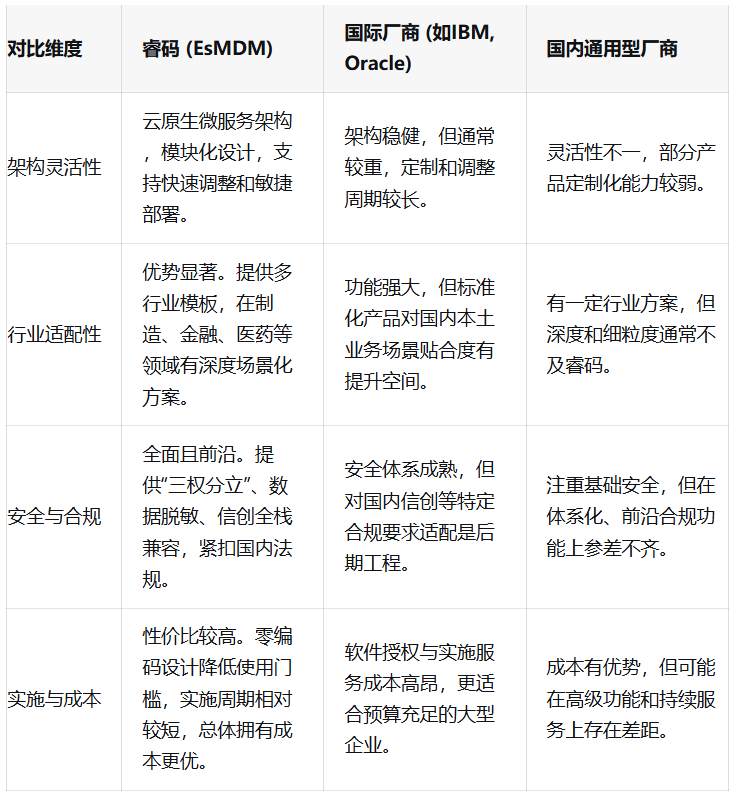 下表从四个关键维度,对比了睿码与市场上其他主流主数据管理解决方案的差异: