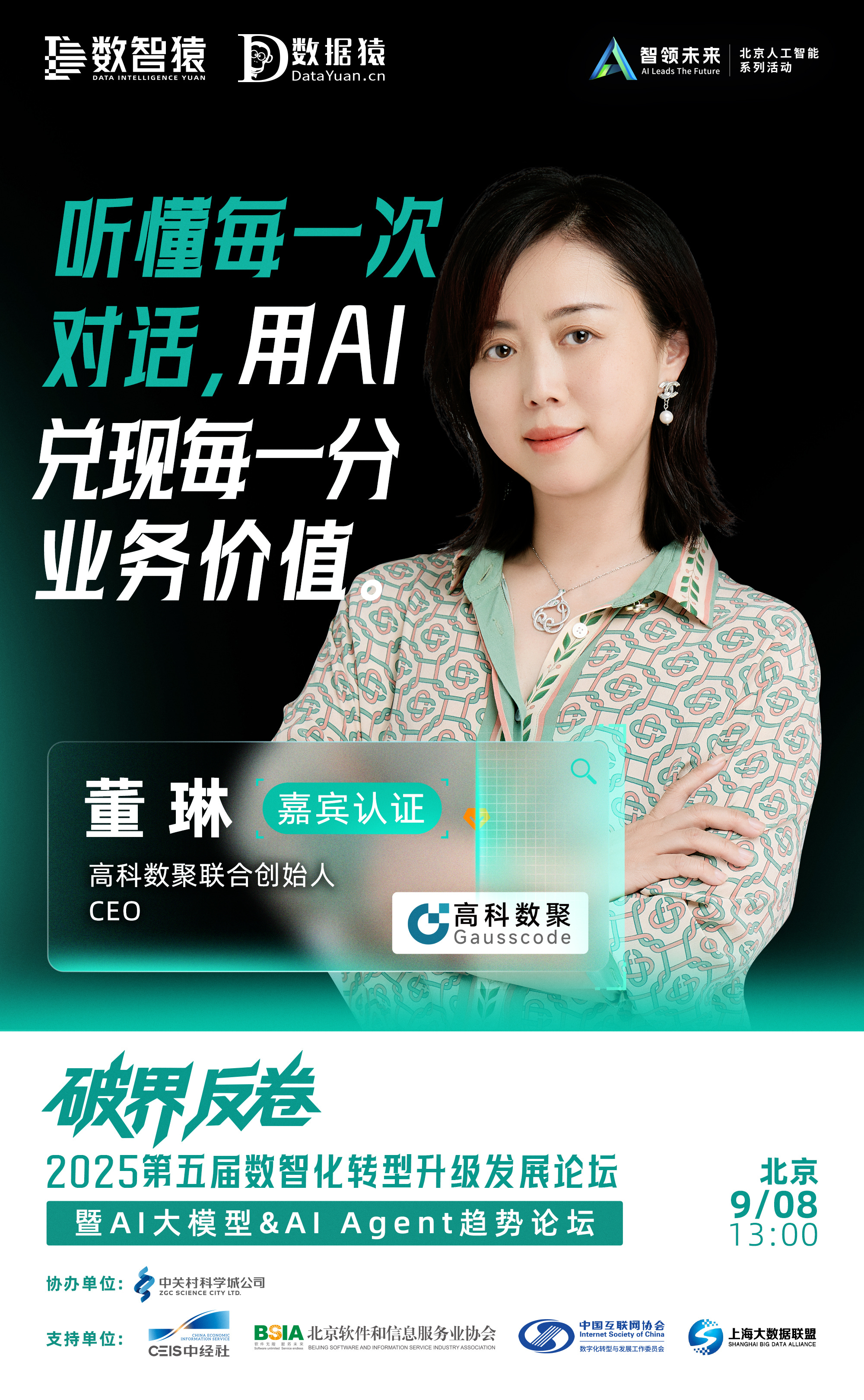 高科数聚联合创始人、CEO 董琳,已确认出席由数智猿×数据猿联合主办,中关村科学城公司协办,新华社中国经济信息社×北京软件和信息服务业协会×中国互联网协会数字化转型与发展工作委员会×上海大数据联盟作为支持单位的“2025第五届数智化转型升级发展论坛——暨AI大模型&AI Agent趋势论坛”。