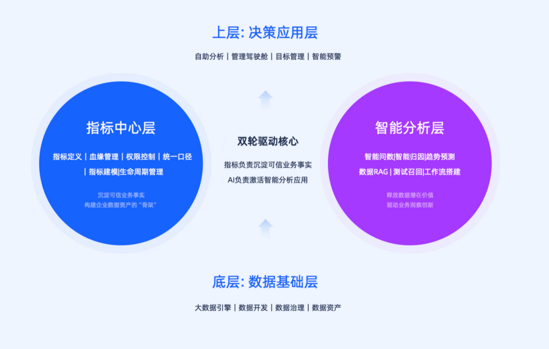 ·以数据智能为一翼:在底座之上,围绕指标体系、知识库和多智能体应用,推动企业从”报表驱动”升级为”指标+智能体驱动”,形成跨部门对齐的数字语言和可复盘的决策机制;