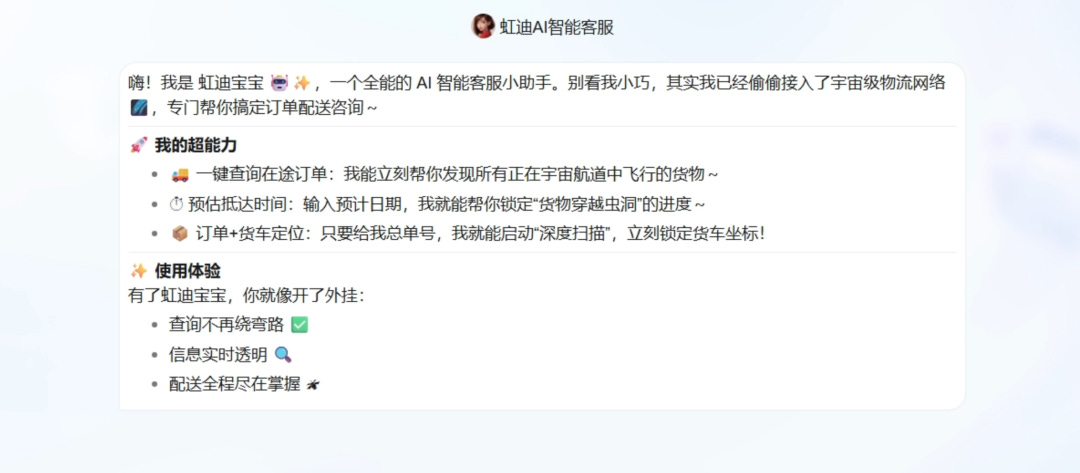 ·AI Agent嵌入业务流程:我们与壹沓科技合作构建的AI智能体深度融入日常运营,使其成为员工的“数字同事”。虹迪AI智能客服可自动处理来自客户的常规订单查询与跟踪请求,实现秒级响应,仅将复杂问题转交人工,显著提升客户体验与服务效率。