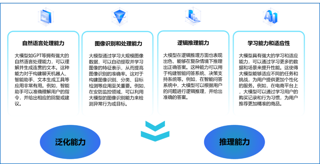 目前,企业应用大模型主要聚焦于这两大能力。利用其泛化性,企业可构建智能客服、自动内容生成和设计工具;借助推理能力,则能实现数据分析、决策支持和流程自动化,显著提升效率并降低成本。