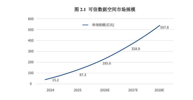 根据赛迪顾问发布的《中国可信数据空间市场白皮书》预测,2024年至2028年,中国可信数据空间市场的年复合增长率预计将高达152.4%。市场规模将从2024年的15.2亿猛增至2028年的约507.8亿元。4年增长超33倍,势头强劲。