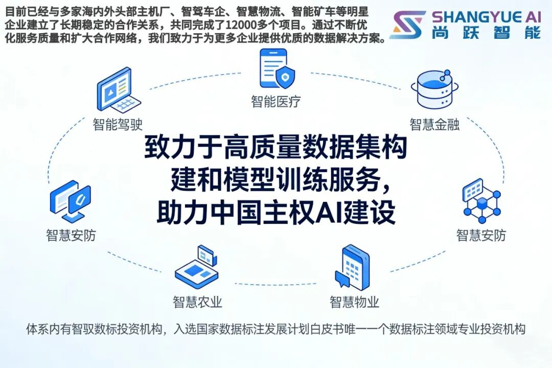 尚跃智能科技河南有限公司 2019 年启航,在郑州、商丘、南通等多地设自建基地,是业内领先的 AI 基础架构与数据智能服务商,专注提供高精度数据解决方案。公司多模态数据产品广泛应用于自动驾驶、大模型、医疗等多领域头部企业与机构。作为 AIIA 联盟委员,旗下智驭数标是国家数据标注白皮书唯一专业投资机构,2025 年发布 MetaAnnotate 智能标注中枢,与多国机构共建南十字星跨洋联盟。