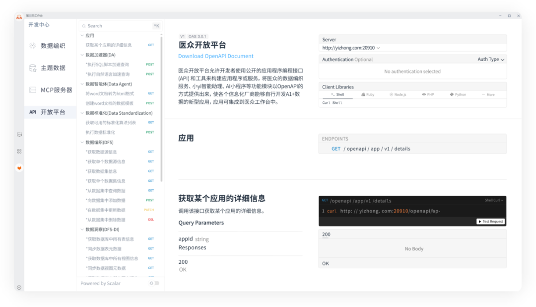 •开放平台:面向开发者和数据高阶使用者,灵活调用医众数据和智能的能力整合平台,OpenAPI和IDE工具赋予了用户调用DataAI能力的灵活性,用户以AI原生的方式使用数据、开发数据应用、研究分析数据,生产效率倍增。