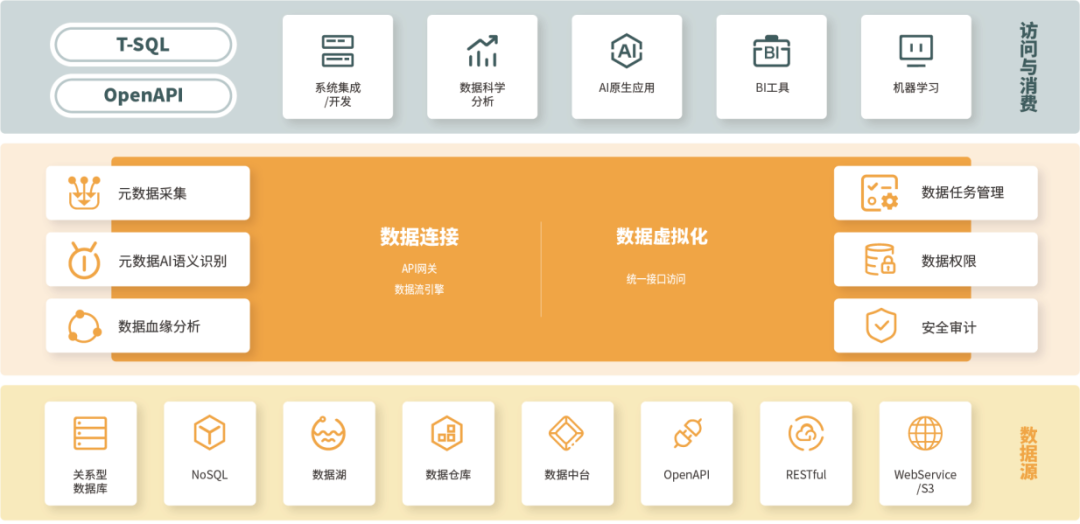 全面覆盖结构化、非结构化、半结构化数据,无缝对接关系型数据库、数据湖、数据仓库、数据中台等各类异构数据源,实现数据源的统一管理,为上层提供丰富的“数据原料”