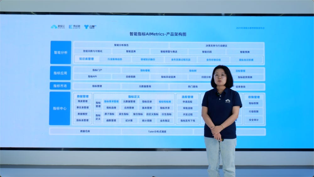 袋鼠云智能指标产品专家加悦在春季发布会上深入探讨AI如何赋能企业决策,AIMetrics作为基于AI的智能指标管理平台,采用四层架构应对:指标中心层管理指标全生命周期并保障数据安全;指标市场层打造企业级指标共享中心;指标应用层提供灵活分析环境;智能分析层通过对话式交互和知识增强技术,输出贴合业务的决策建议。