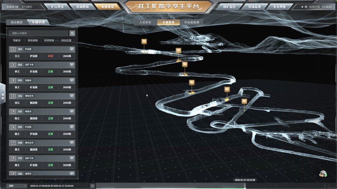 在矿山场景中,十五冶围绕地下作业安全与生产协同构建了实景化监管与运行分析体系。通过构建实景地下矿山数字孪生监管平台,将巷道结构、设备布置、人员定位与环境参数整合到统一空间底座中,实现对重点区域风险等级、人员分布与作业状态的持续感知。在此基础上,生产、安全与调度数据实现统一口径分析,使异常识别从事后统计转向事前预警。数字孪生成为监管与调度的操作界面,推动现场管理从经验驱动走向结构化决策。