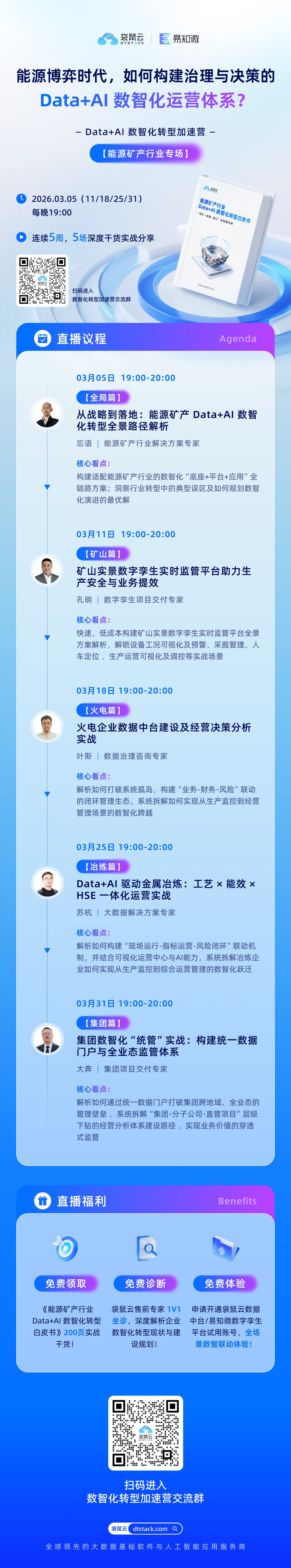 围绕这一底层逻辑,袋鼠云将在后续五场专题直播中,分别结合地下矿山监管、火电企业经营穿透、冶炼企业现场一体化运营协同与集团统管实践,展开更具体的落地路径与实施细节。
