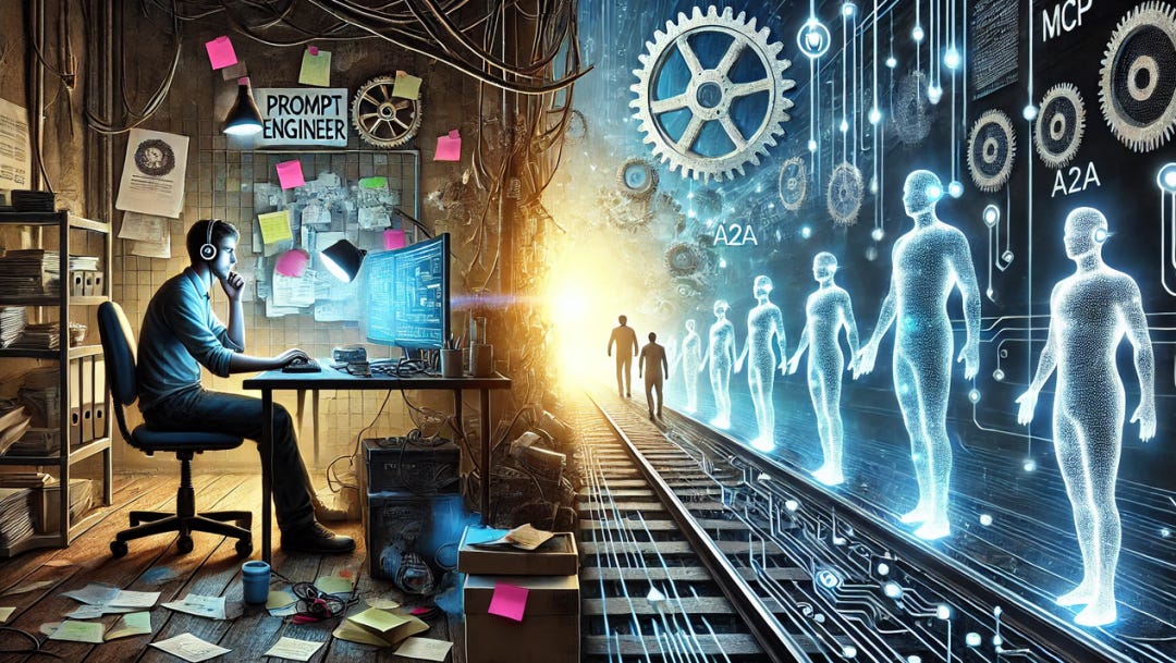 是啊,在这样一个快速变化的时代,普通人要怎么做,才能不被甩下时代的列车呢?大模型爆火之后,Prompt成了AI圈的“香饽饽”。人人都在学提示词技巧,调教DeepSeek、ChatGPT、掌握LangChain、写出像样的函数调用结构,成了AI从业者的新标配。无论是运营、产品、工程师还是自由职业者,都在追赶这波热潮。但你是否也开始察觉——焦虑感,正在悄悄蔓延。“我学了这么多Prompt技巧,怎么感觉用处越来越有限?”“LangChain、AutoGPT都折腾过了,结果被一个插件直接替代了。”“每天都在调AI,但越来越像在打杂、当工具人。”这种不安不是偶然,而是一种结构性信号:AI世界的风向,正在发生变化。过去一年我们围着“一个AI”转——怎么把一个大模型用得更聪明、怎么设计好Prompt让它完成任务。但2025年开始,一个新的范式正在浮出水面:多个智能体之间可以通信、协作、彼此调度。它们正在形成一个“Agent协作网络”,一个全新的“AI互联网”。而在这个转折点上,如果你还沉迷于打磨提示词、封装UI,可能会错过一次真正的范式迁移红利期。下一代的AI从业者,不是会调模型的人,而是能“组织AI协作”的人。不是Prompt工匠,而是Agent架构师。在这篇文章中,我们将深入剖析:为什么现有的技能体系正逐渐失效;智能体网络将如何重塑从业者角色;普通AI人如何找到自己的入场点,不被这波浪潮淘汰。当然,面对新时代的时候,谁都不是先知,我们也只能是“盲人摸象”,试图去讨论一下前进的方向。如有不妥,请指正。