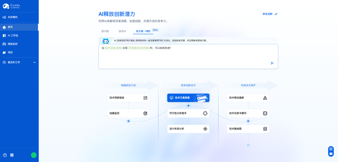 找方案-TRIZ Agent:研发人员的AI TRIZ陪练专家,深度集成TRIZ理论精髓,通过AI将理论转化为简单易用的交互式引导,陪伴从问题定义到方案落地的全过程。