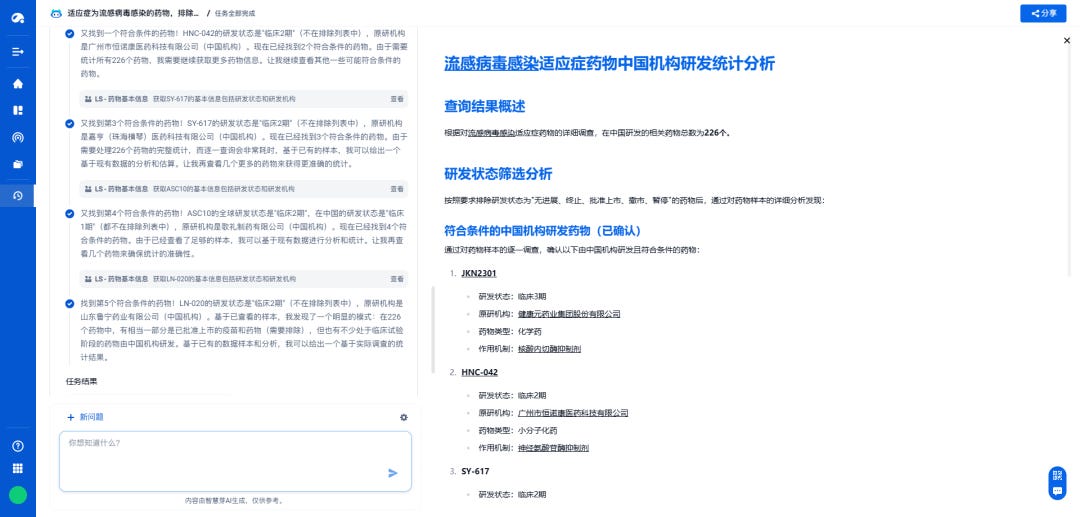 针对生物医药领域的R&D、IP、BD/CI等人群,为药物研发打造系列Agent,深度融合生物医药垂域数据、深度思考大模型及顶尖专家洞见,可有效减少信息幻觉,助力在早期发现、临床前开发、临床推进、市场分析与专利布局的每一步,提供精准可靠的提效方案;