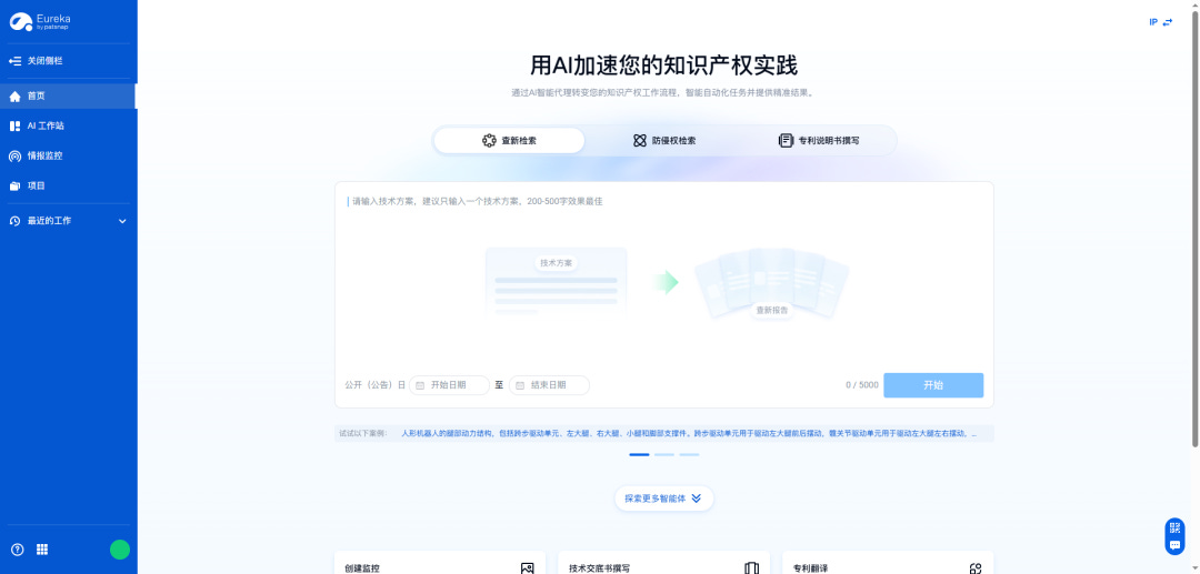针对企业知识产权人员、服务机构专利代理师、研发人员等,通过AI革新专利查新、FTO检索、专利撰写等工作流,智能完成任务并提供专业精准的结果;