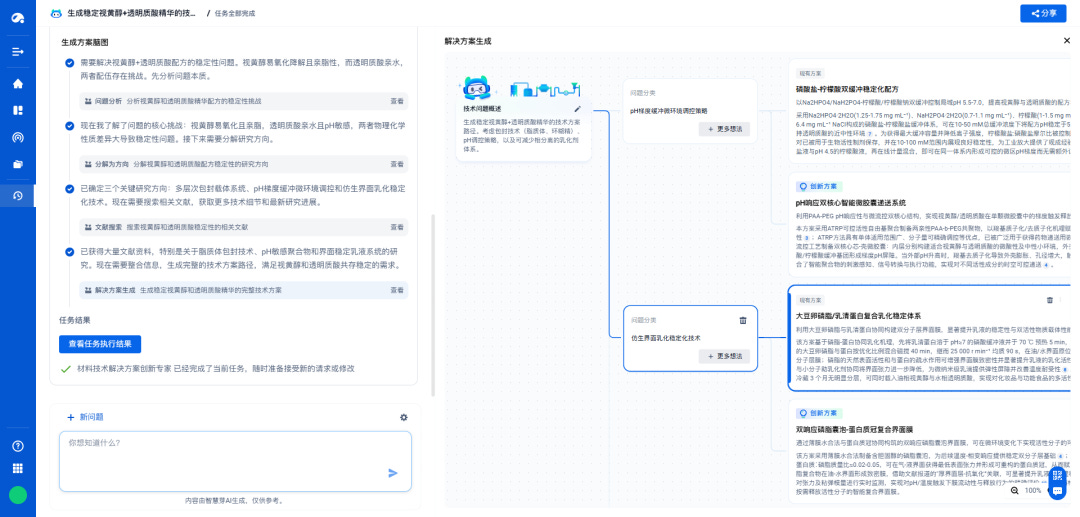 配方助手Agent:基于输入的目标产物及性能目标(如防晒霜、防爆轮胎橡胶),在几秒内即可生成多套科学、可落地的原材料配方设计方案。