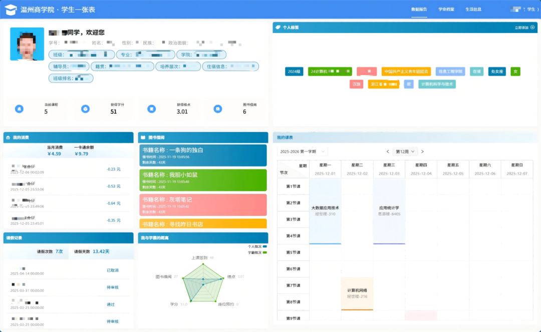 (2)信息服务中心拆解与响应:我们构建“跨域数据关联网络”。打破签到、学业、消费、门禁、上网、图书借阅、能耗等数据要素的壁垒,通过规则引擎与机器学习模型,挖掘其内在联系。如“低绩点+夜间高频上网+食堂消费骤降”可关联触发“综合学业生活关怀预警”,让数据要素在碰撞中产生倍增价值。