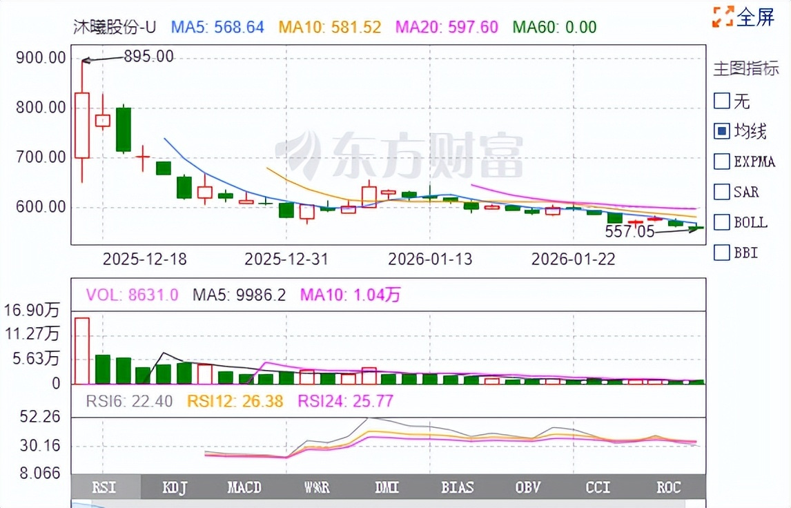 但资本市场终究回归基本面。自2025年12月上市首日冲高至895元后,沐曦股价一路震荡下行,2026年1月一度跌至560元,较峰值回撤近37%。截至1月底,股价已经低于600元,成交量显著萎缩——市场已从“打新狂欢”转入“财报观察”模式。