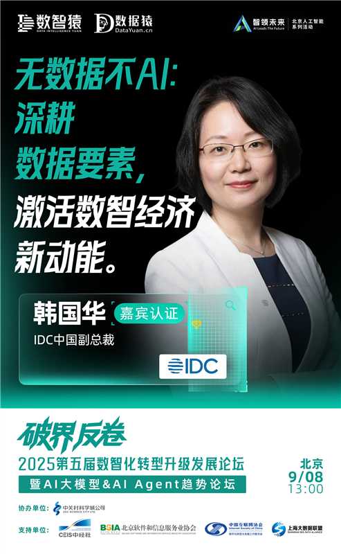 IDC中国副总裁 韩国华,已确认出席由数智猿×数据猿联合主办,中关村科学城公司协办,新华社中国经济信息社×北京软件和信息服务业协会×中国互联网协会数字化转型与发展工作委员会×上海大数据联盟作为支持单位的“2025第五届数智化转型升级发展论坛——暨AI大模型&AI Agent趋势论坛”。