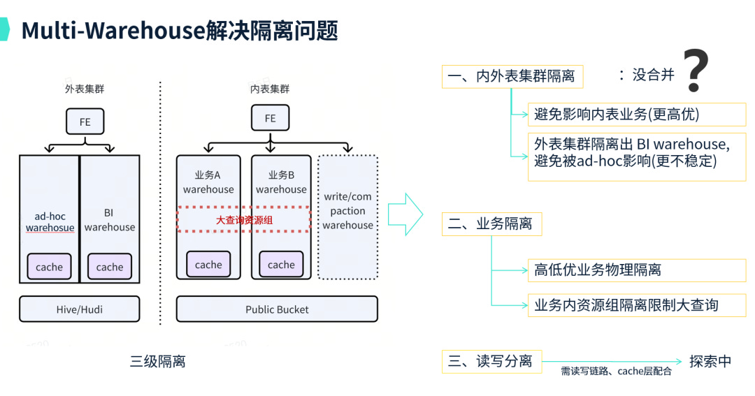 针对单集群内隔离困难的问题,团队设计了基于Multi-Warehouse的三级隔离策略。
