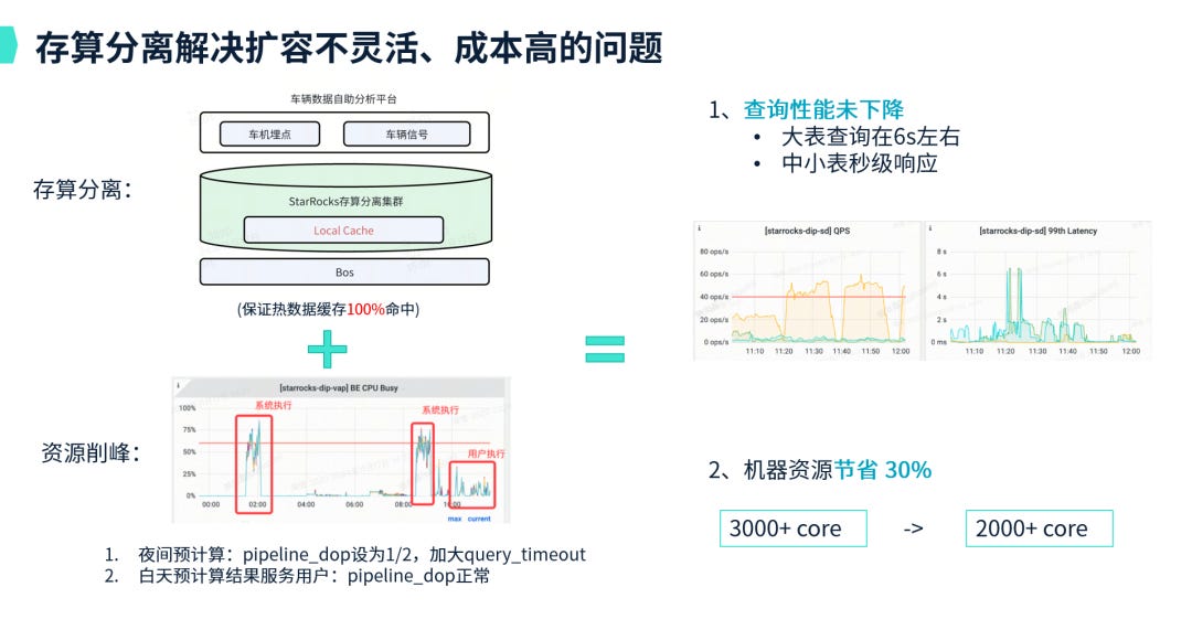 其次是机器扩容不灵活且成本高昂的问题。车辆数据自助分析平台随着业务发展需要接入更多数据源,单表数据量迅速增长至万亿行级别,存储需求达到250TB。在存算一体架构下,只能按照存储需求扩容计算资源,但分析显示99%的查询只关注近一个月的热数据,大量历史数据很少被访问,导致大量CPU和内存资源浪费。