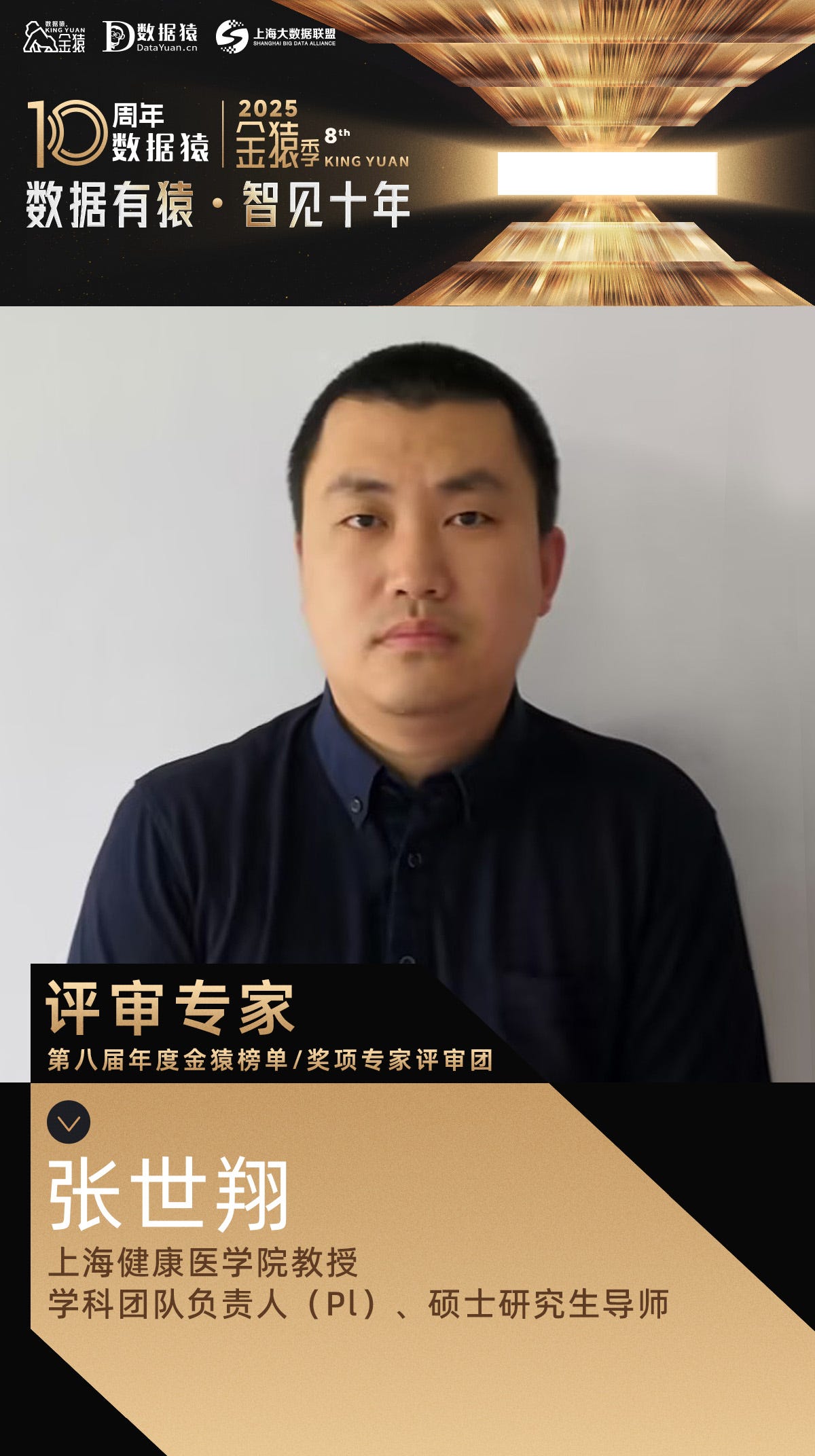 【终审团专家公告】上海健康医学院教授、学科团队负责人(Pl)、硕士研究生导师张世翔,已确认成为“2025第八届年度金猿”榜单/奖项评审团专家评委,并将授予评委荣誉证书。