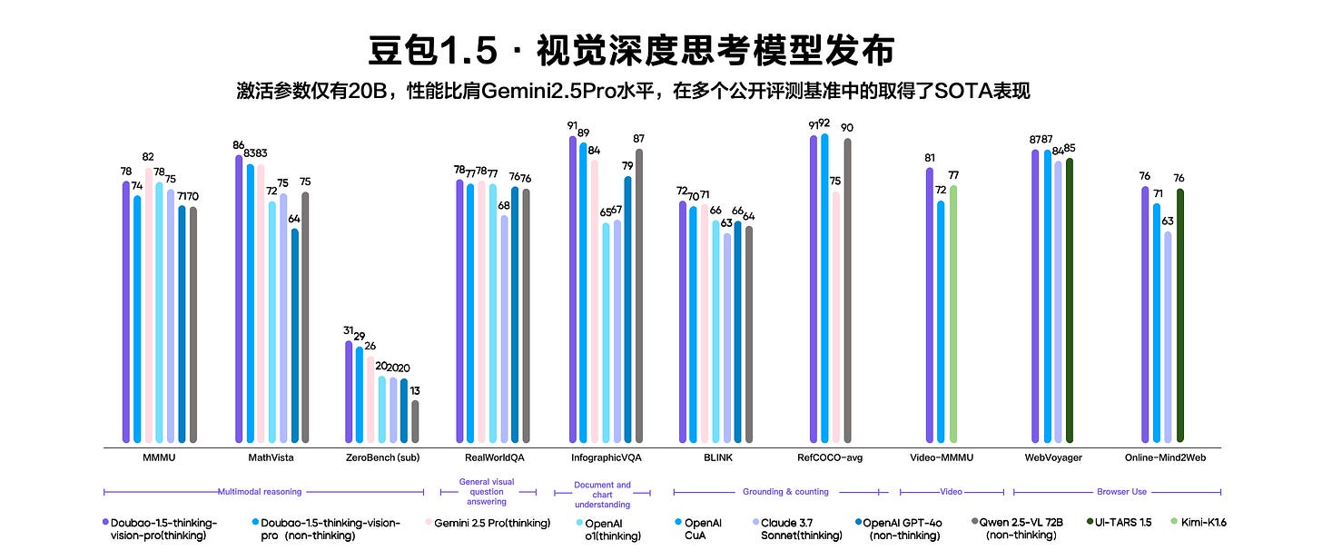 新发布的豆包1.5·视觉深度思考模型(Doubao-1.5-thinking-vision-pro),激活参数仅20B,但具备强大的多模态理解和推理能力,在60个公开评测基准中,有38个取得 SOTA 表现,在视频理解、视觉推理、GUI Agent能力等方面均处于第一梯队。目前,该模型已在火山方舟上线。