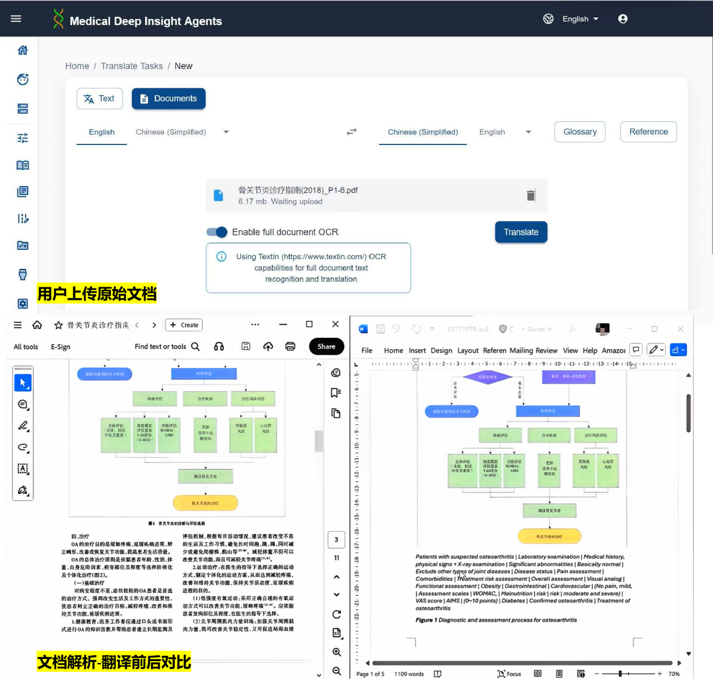 在实际应用中,用户一键上传原始文档,MDI平台即可在分钟级内完成数百页包含大量专业术语的医疗文档翻译任务,为临床诊疗、医学知识服务、医药研发等场景提供有效支撑。