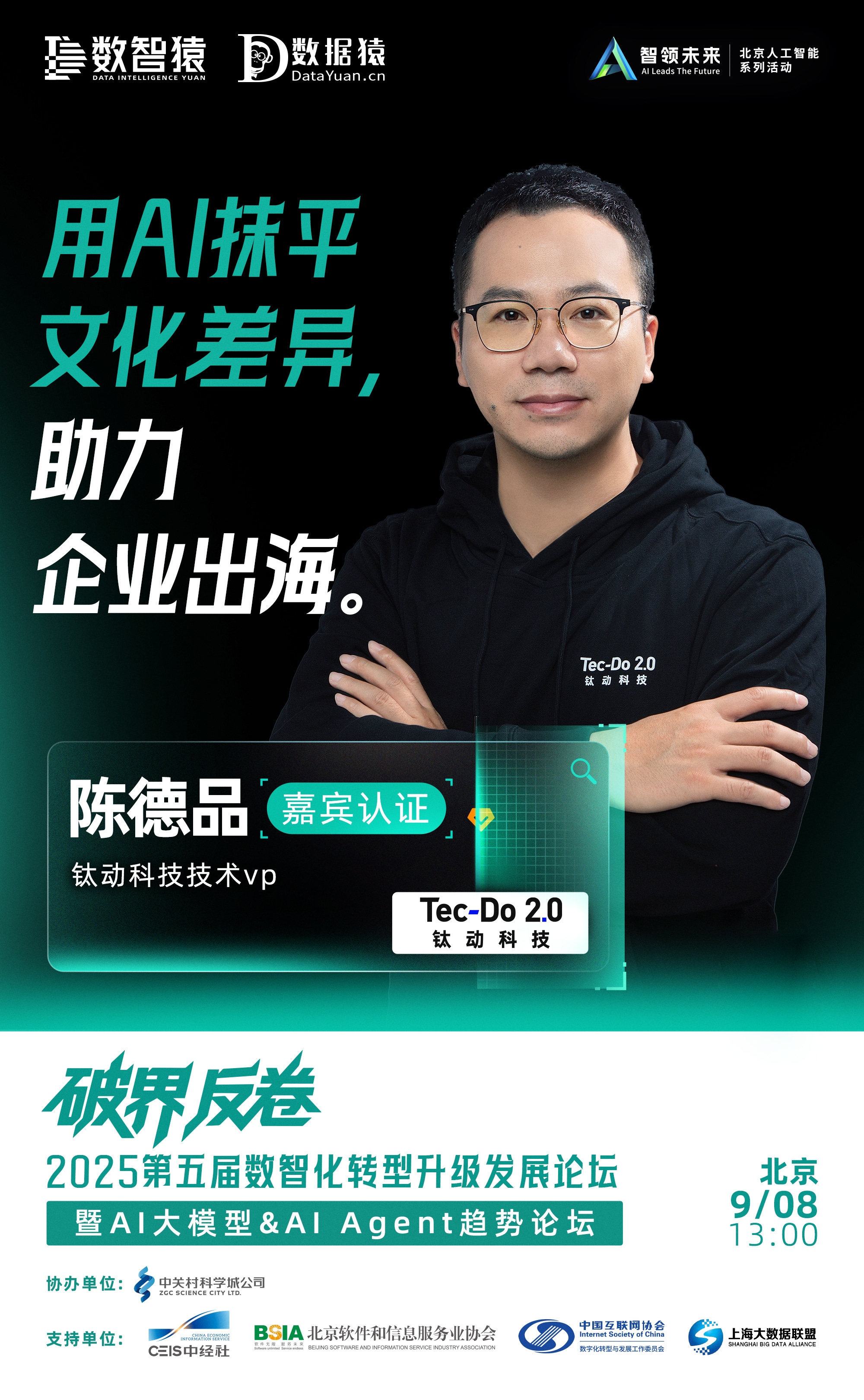 钛动科技技术VP 陈德品,已确认出席由数智猿×数据猿联合主办,中关村科学城公司协办,中国经济信息社×北京软件和信息服务业协会×中国互联网协会数字化转型与发展工作委员会×上海大数据联盟作为支持单位的“2025第五届数智化转型升级发展论坛——暨AI大模型&AI Agent趋势论坛”。