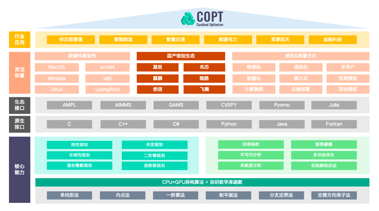 在国产CPU+GPU异构计算体系下,国产求解器COPT实现了在量子计算、具身智能、大规模物流、供应链、电网出清调度、投资组合优化、市场均衡计算、矩阵补全等问题上数十倍乃至数万倍的求解加速,为我国人工智能、高性能计算(HPC)和科学仿真领域发展提供核心算力支撑,显著提升了国产软硬件协同创新能力和核心竞争力,确保了关键计算基础设施的完全自主可控。