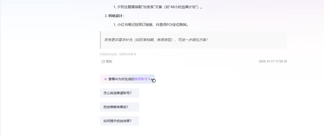每次投放结束后,系统会自动生成详细的结案报告,并对本次投放的数据进行深度分析,提炼有价值的洞察。这些数据会自动沉淀到企业的专属数据库中,为下一次投放提供参考依据。随着投放次数的增加,系统的推荐精准度会不断提升,真正实现了“越用越智能”的效果。