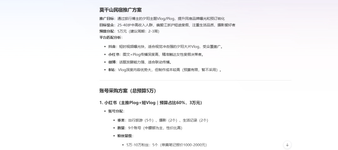 该系统整合了全网300万+红人标签数据,结合DeepSeek大模型的深度学习能力,实现了跨平台红人的精准匹配。企业只需输入品牌信息、产品特点、目标人群、营销目标等基础需求,系统即可提供营销解决方案,并通过AI智能从海量红人资源中筛选出最合适的候选名单,并给出详细的匹配度分析和效果预测。